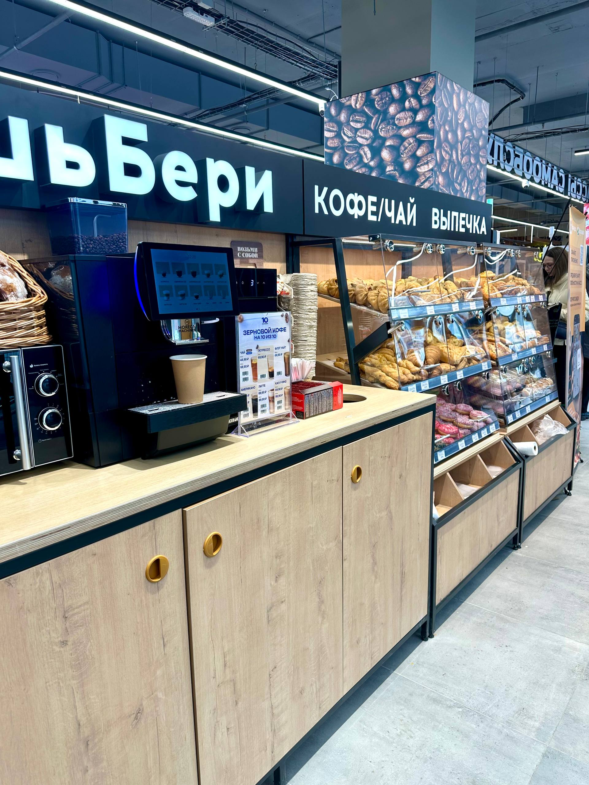 ✔️ сразу у входа — стойка с кофейным автоматом, выпечкой и различными готовыми блюдами;