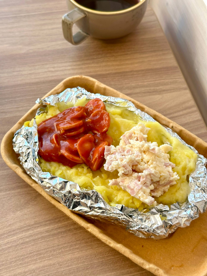 Для себя я выбрал картофель с ветчиной и сыром и сосиски гриль. Мой напарник заказал картофель с тремя топпингами: острый карбонад, крабовый и жульен с курицей.