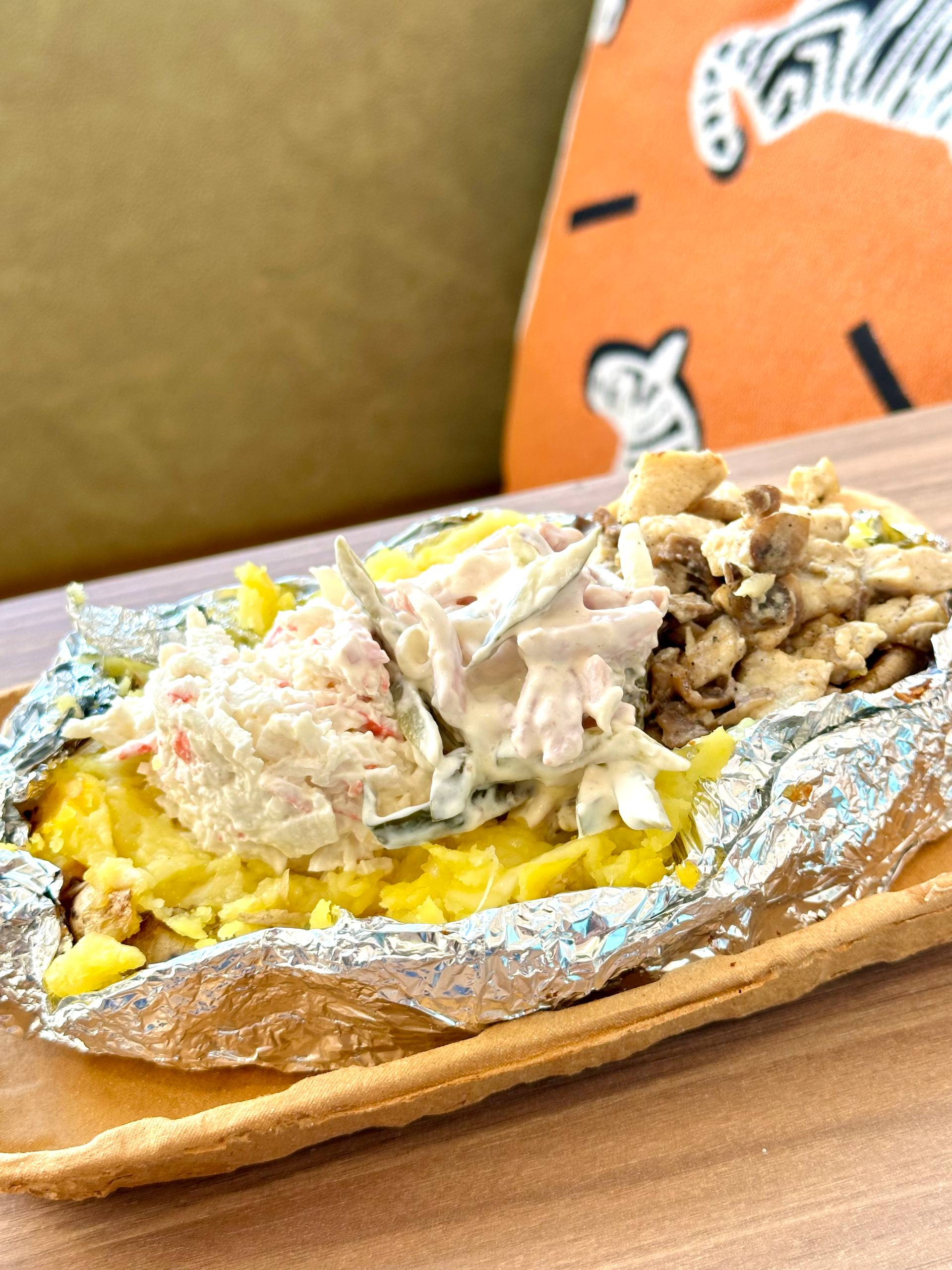 Для себя я выбрал картофель с ветчиной и сыром и сосиски гриль. Мой напарник заказал картофель с тремя топпингами: острый карбонад, крабовый и жульен с курицей.